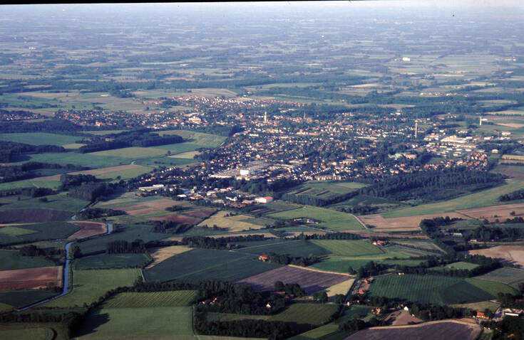 Quakenbrück im Artland im Jahr 1997: In Bildmitte sieht man Quakenbrück von Westen, im unteren Drittel des Fotos sieht man links das Halberbe Wellinghorst an der Kleinen Hase, in der Mitte das Halberbe Vortmann (heute Jäger) und rechts die Friedhorst und den Sportplatz von Groß Mimmelage.