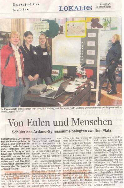 - Jugend forscht Regionalwettbewerb am 14. und 15. Februar 2008 in Emden. Dorothee Krafft (Mitte) und Rike Öhm erreichen mit ihrer Arbeit "Entwicklung eines Programms zur Bestimmung der Eulenpopulation in Wasserhausen" den 2. Platz und erhalten einen Handwerkskammer-Sonderpreis